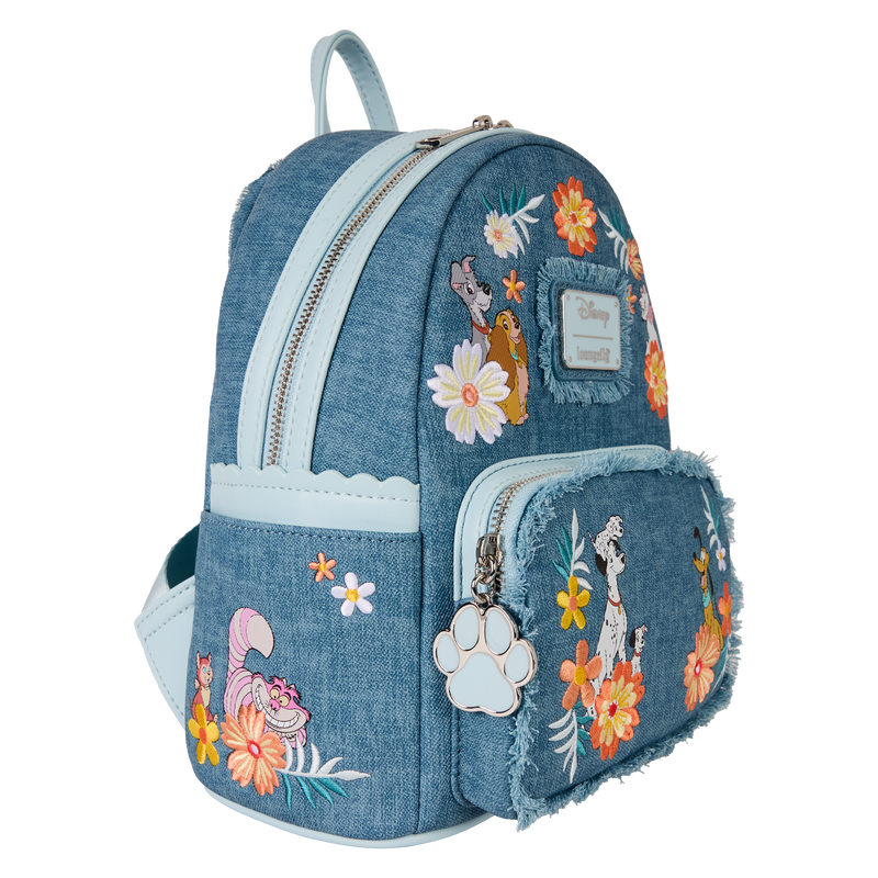 This denim mini backpack is covered in embroidered floral details – amongst them you’ll find images of your favorite Disney dogs and cats!