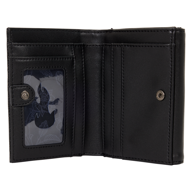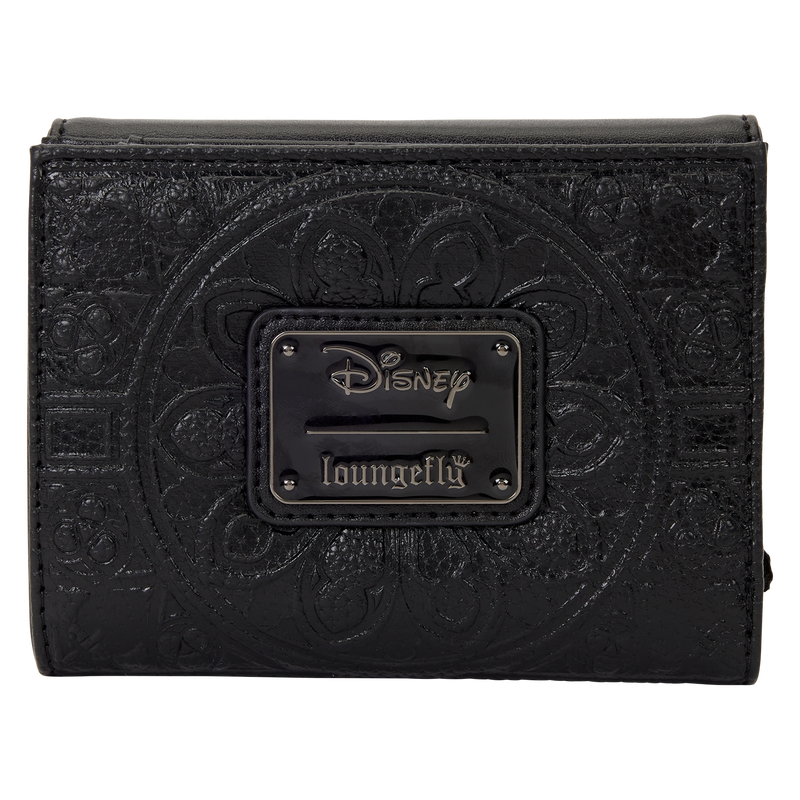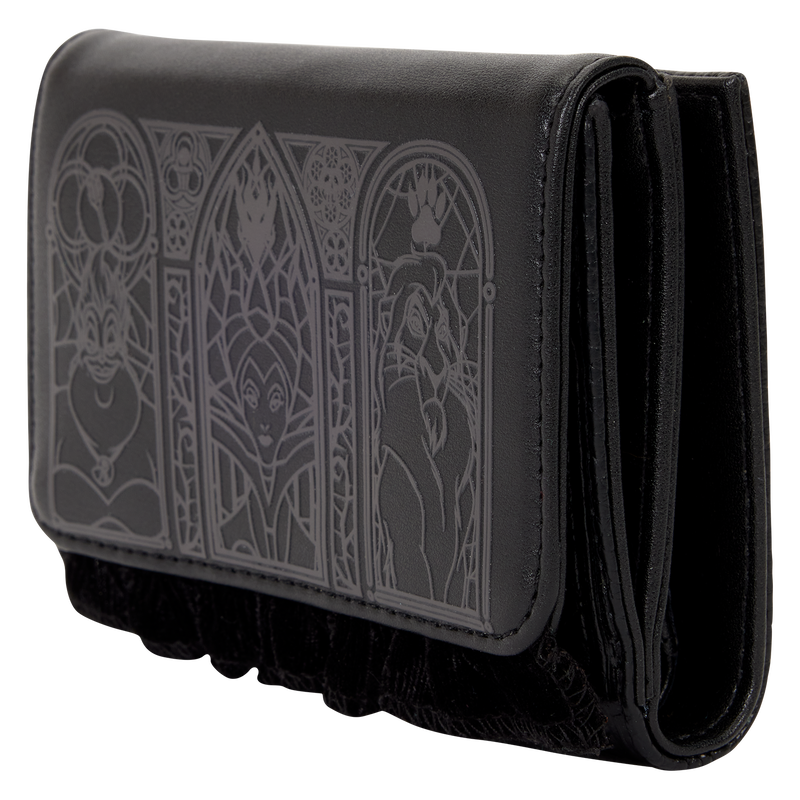 The front of this wallet features a design with three stained-glass windows featuring Ursula, Maleficent, and Scar. Velvet accents and shimmer embroidery elevate the look. Inside, there are five card slots and one clear slot for an ID.