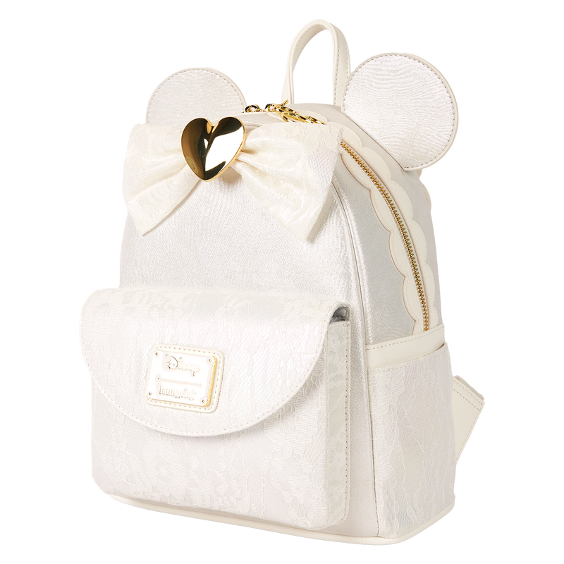 Iridescent lace covers the front pocket, side pockets, and bow. The center of the bow has a golden molded-metal heart charm.