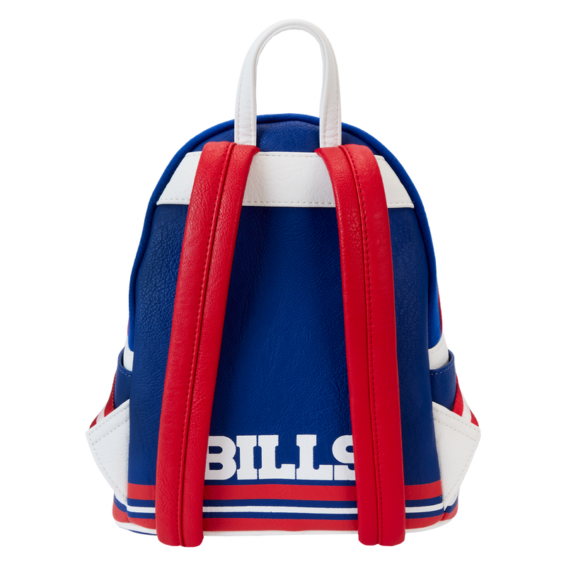 Clap and cheer with your favorite team gear! Stand out from the crowd with our Buffalo Bills Varsity Mini Backpack. This sturdy backpack, fashioned as a varsity jacket, scores big points in details. A chenille patch logo and helmet patch add a winning look, along with red, white, and blue jersey material appliques in Buffalo Bills colors. Real metal snaps also line the front for a “buttoned-up” look. Pack just what you need for the day to show off your team pride.