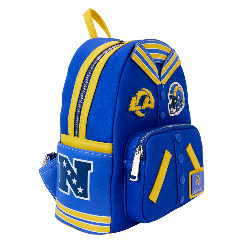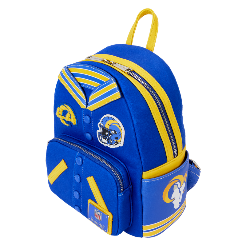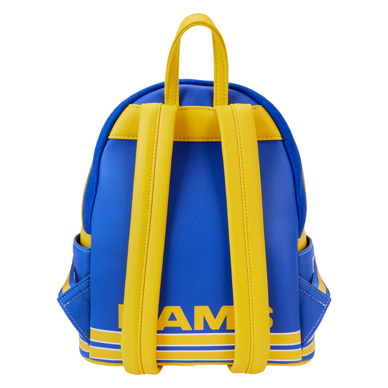 Show your colors proud and true—you’ve got spirit, yes you do! Cheer your team in style! Our sturdy Los Angeles Rams Varsity Mini Backpack will stand out in the crowd. This backpack, fashioned as a varsity jacket, scores big points in details. A chenille patch logo and helmet patch add a winning look, along with royal blue and yellow jersey material appliques in Los Angeles Rams colors. Real metal snaps also line the front for a “buttoned-up” look. Pack just what you need for the day to show off your team pride.