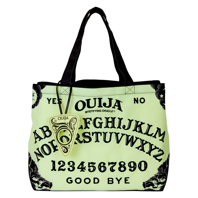 This canvas tote bag features printed details in the design of a Ouija board. You’ll find “Ouija” written at the top with “Yes” and “No” on either side. Below is the alphabet, followed by numbers 1-9. Below, it says “GOOD BYE.” Attached to the bag is a glow-in-the-dark planchette charm!