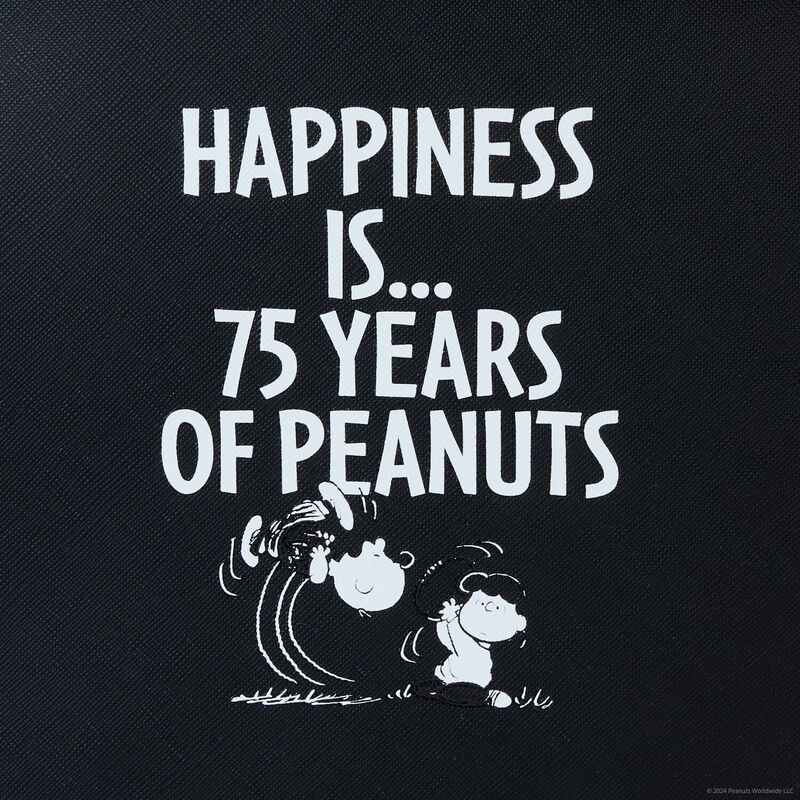 Happiness is…a big celebratory feeling you can take with you wherever you go. Celebrate the 75th anniversary of Peanuts™ with our mini backpack featuring the whole gang. You’ll be able to spot the embroidered silhouettes of Charlie Brown and his friends against a black background on the front pocket. Charlie Brown is flying a kite, and his characteristic wavy line on his shirt appears below. The signature yellow on his shirt appears above as a shiny, textured detail. The wavy line makes an encore as a die-cut feature, forming the top handle above. Flip the backpack around, and you’ll find the words “Happiness is…75 years.” Pack your daily essentials to commemorate a milestone anniversary and add a little character of your own.