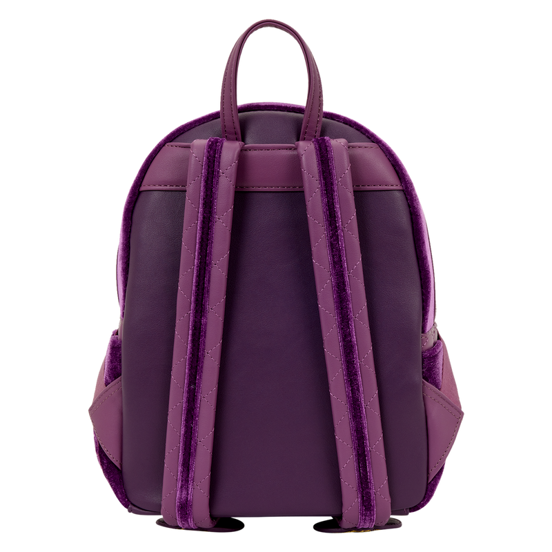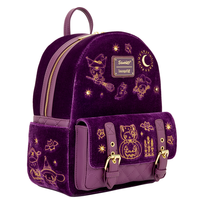 This bag features purple faux velvet with your favorite Sanrio characters embroidered in gold all over. They’re all wearing Halloween costumes – you’ll find Hello Kitty dressed as a cat popping out from a pumpkin on the front, and Kuromi wears a witch hat and is riding a broom! Other fun details like metal charms and real beads give it an elevated feel. For an extra cute touch, you’ll find jack-o’-lanterns on the straps!