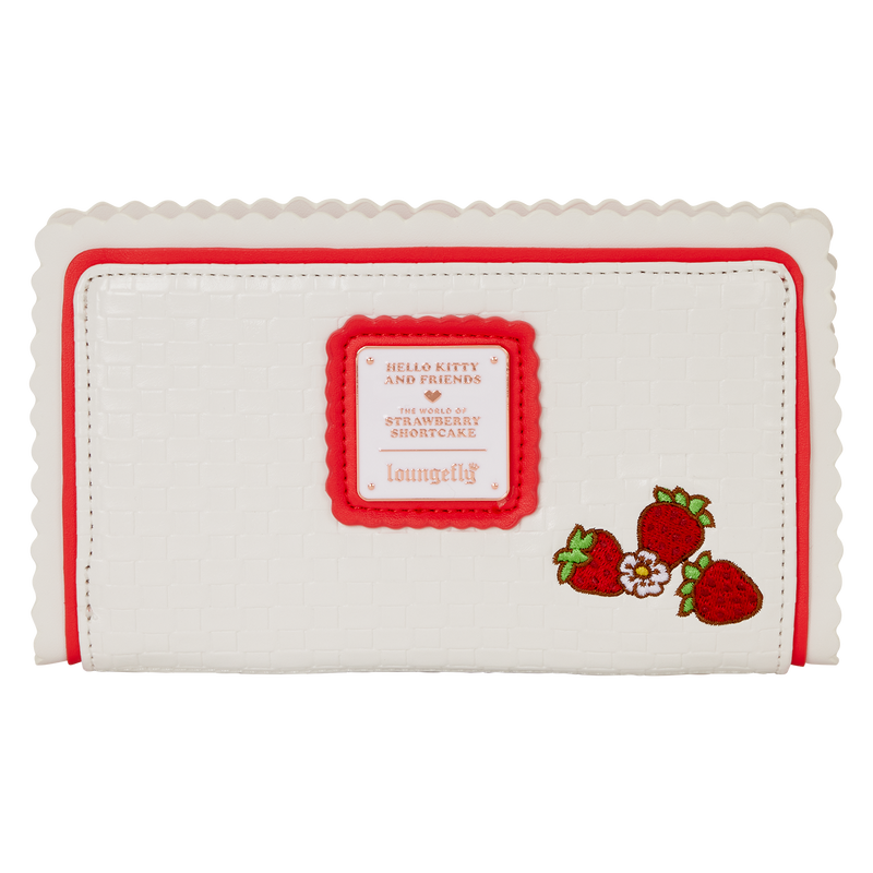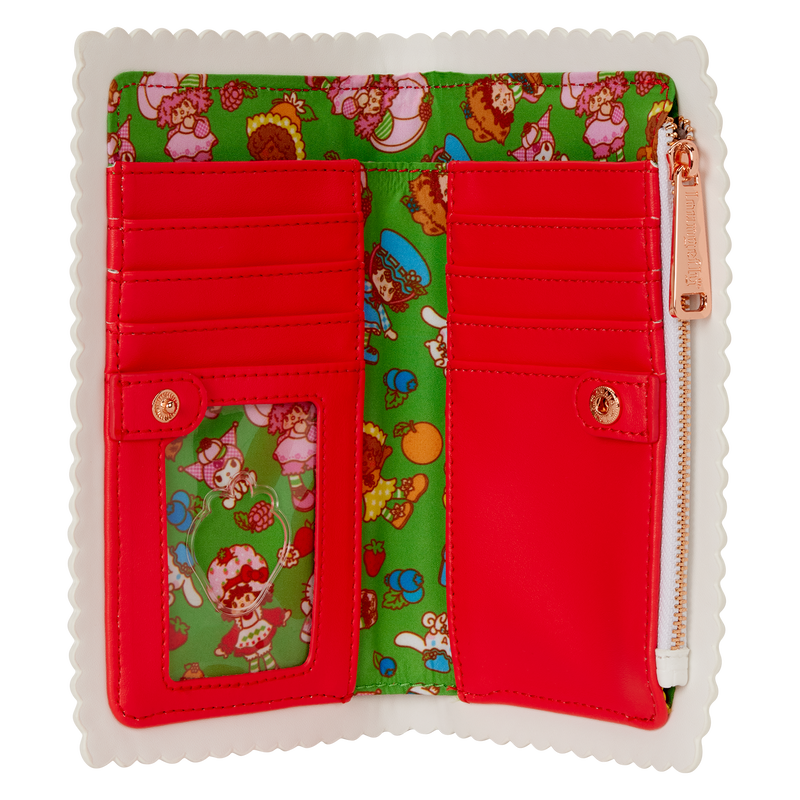 This flap wallet features Strawberry Shortcake and Hello Kitty! They both wear Strawberry Shortcake’s hat and Hello Kitty’s bow! They’re surrounded by embroidered strawberries. Take a look inside to find seven card slots and one clear ID slot. A scalloped edge around the wallet and a strawberry scent makes this accessory extra special!