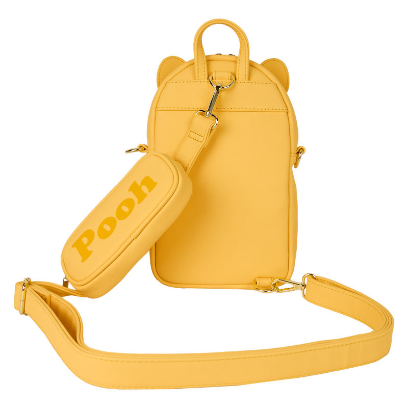 This sling bag is inspired by Winnie the Pooh. It follows a similar style to our mini backpacks, featuring a front pocket and a main zippered compartment. You’ll find 3D ears sticking out from the top. The front pocket is red and features an all-over pattern of Pooh’s silhouette! Attached to the crossbody strap is a coin bag that says “Pooh” on it!